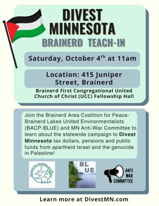 Brainerd Area Coalition for Peace and Brainerd Lakes United Environmentalists (BACP-BLUE) will host a divestment teach-in conducted by the Minnesota Anti-War Committee on Saturday, October 4, 2025. The divestment teach-in will be held in the Brainerd First Congregational United Church of Christ (UCC) Fellowship Hall. The Brainerd UCC is located at 415 Juniper Street, Brainerd, near Gregory Park. The Fellowship Hall is located in the downstairs section of the Brainerd UCC. The divestment teach-in is scheduled to last from 11 a.m. to 12:45 p.m.